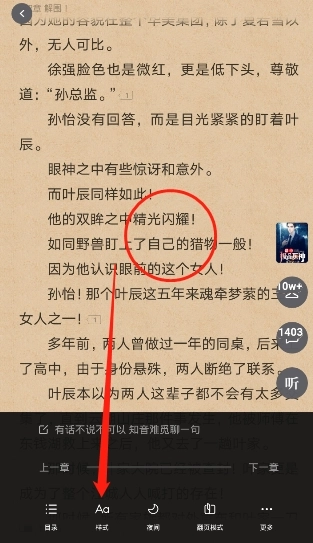 进入阅读模式后,轻点屏幕中间位置,调出设置菜单,再点击“Aa样式”这一选项。