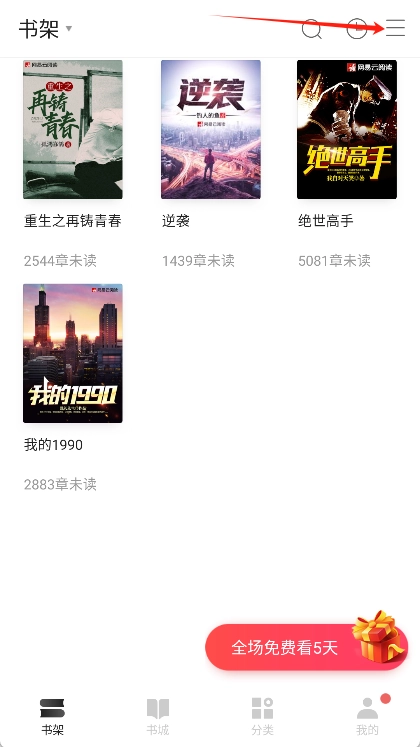 访问本地书籍的操作步骤是:在书架界面中,点击右上角的三条横线图标。