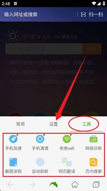 点击图中的小海豚按钮,就能看到这里提供免费WiFi工具和清理小工具。