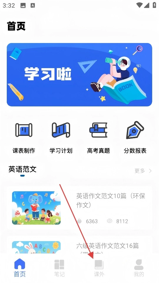 在首页点击底部【课外】按钮,进入课外学习页面。