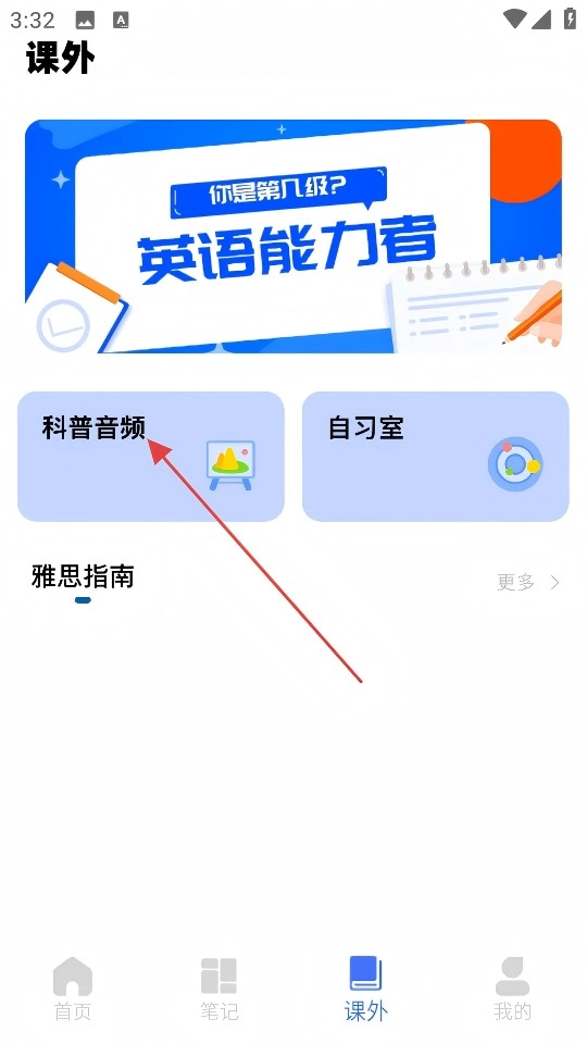 在课外学习页面点击【科普音频】,进入听科普列表页面。