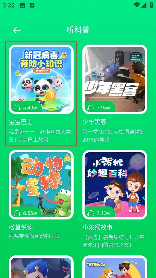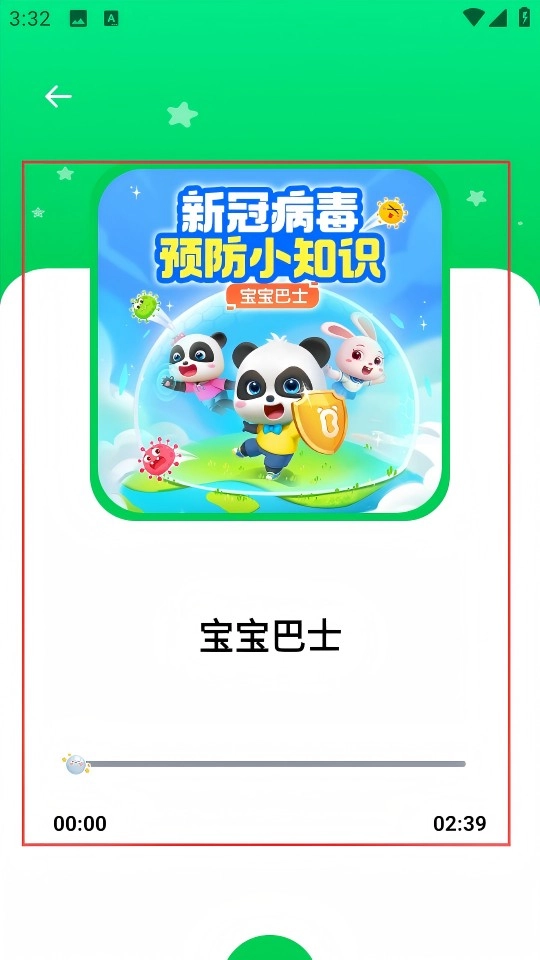 从听科普的列表里找到【宝宝巴士】的音频并点击进入播放页面。