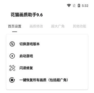 花猫画质助手9.6游戏版是该系列中相当实用的一个版本,它是专为FPS游戏玩家设计的手机画质辅助工具,能帮我们轻松突破手机性能瓶颈,解锁各类高清画质与超高帧率,让游戏体验更流畅!这款9.6游戏版还提供多种画质选项供自由挑选,让我们在游戏里看得更清晰,击败敌人的概率也会显著提升。要是觉得视野不够开阔,还能在超大广角专区进行调整,大幅拓宽游戏中的视野范围,从而提前察觉敌人的动向!