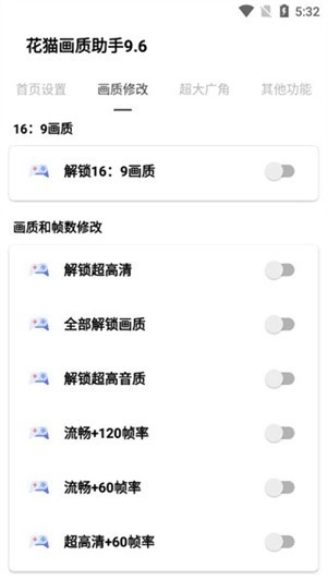 点击“画质修改”按钮后,能够挑选多种不同的画质与帧率选项,像解锁16:9画质这类功能也包含在内。