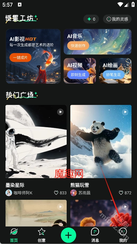 恒星AI是一款十分炫酷且专业的AIGC视频生成工具。这款工具对技术要求不高,即使是毫无基础的新手也能轻松上手使用。打开恒星AI安卓版的主界面,能看到它包含AI影视、AI音乐、AI视频和AI绘画在内的四大核心功能。只需挑选你需要的功能,输入清晰的文字指令,它就能迅速为你生成完整的作品!