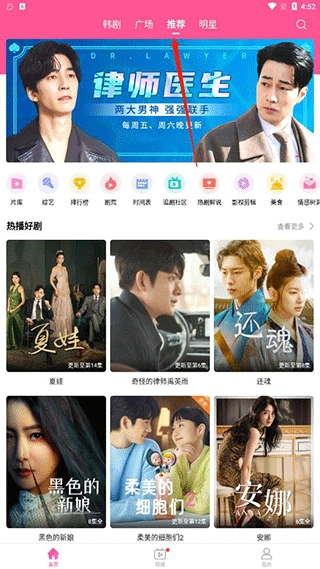 打开韩站首页,映入眼帘的是四大核心板块:韩剧、广场、推荐与明星。点击“韩剧”板块,便能浏览当前热门剧集、精选佳作以及各类剧集分类。