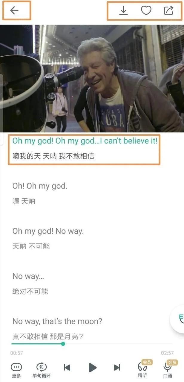 听力专辑里既有纯音频内容,也包含视频内容。页面右上角设有三个功能按钮,考虑到部分用户可能会前往没有网络的场所,大家可以提前进行缓存或收藏操作。