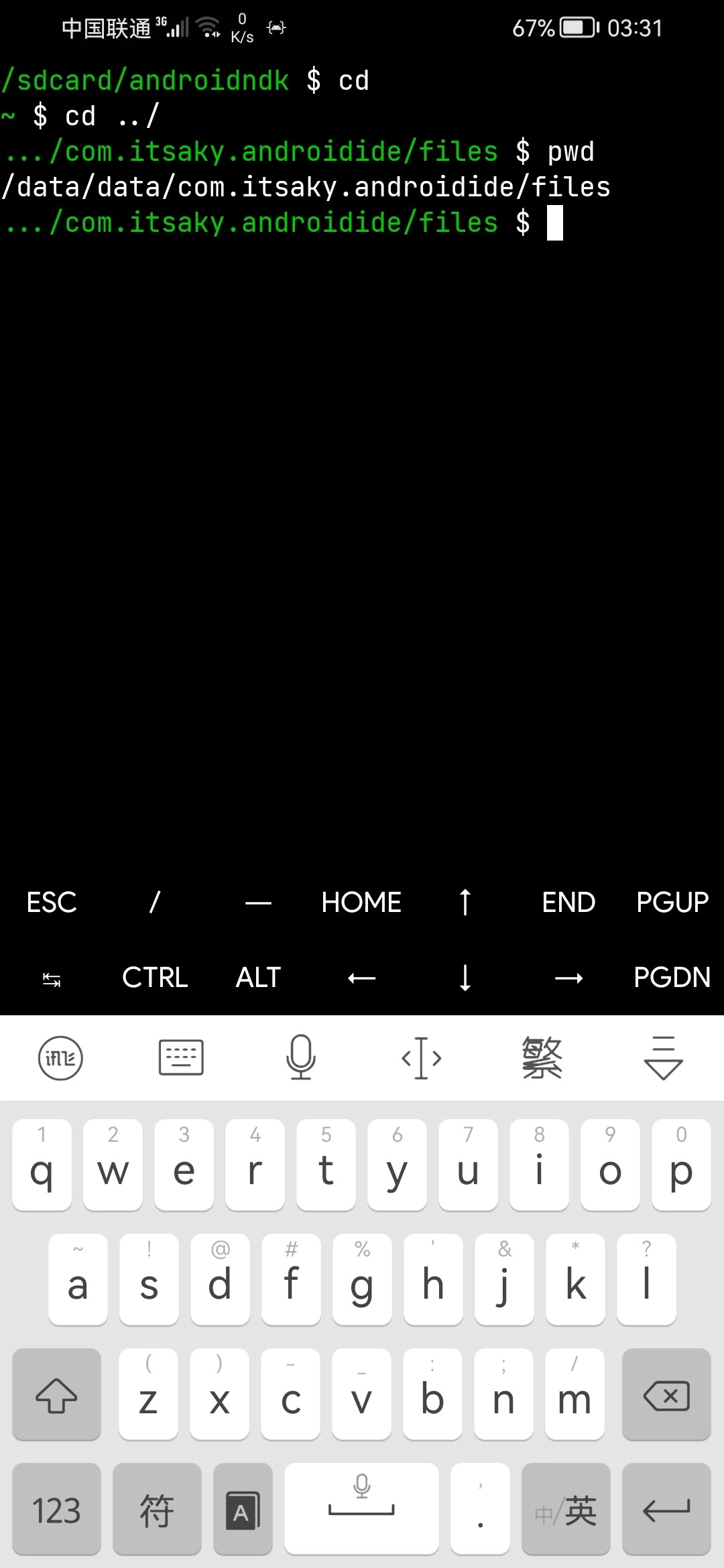 完成后再通过 cd 命令切换至 /data/data/com.itsaky.androidide/files 目录;