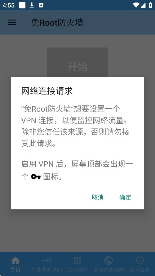 打开免Root防火墙App后,先点击主界面的“开始”按钮进入设置页面。